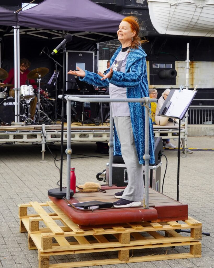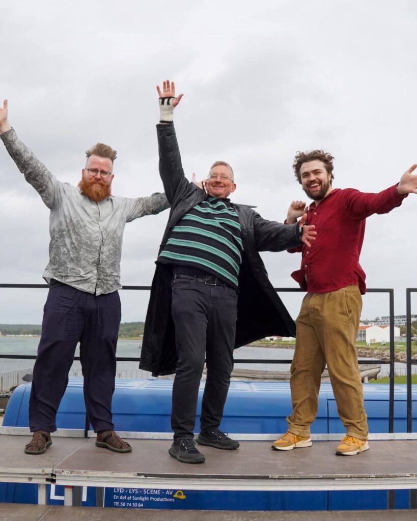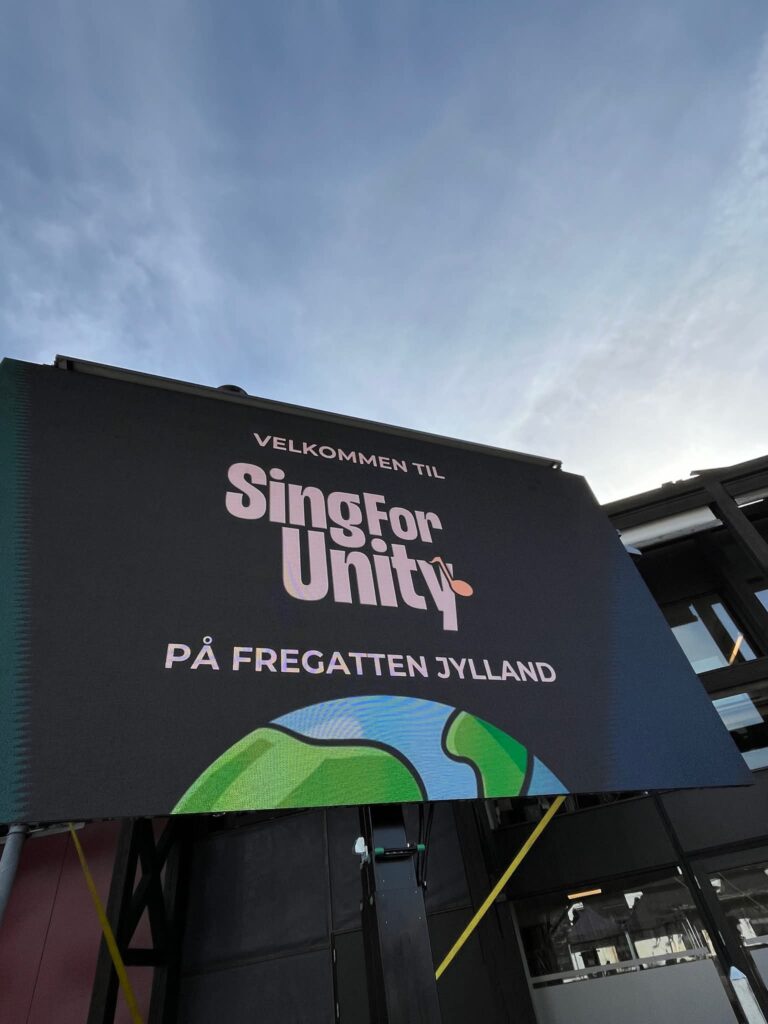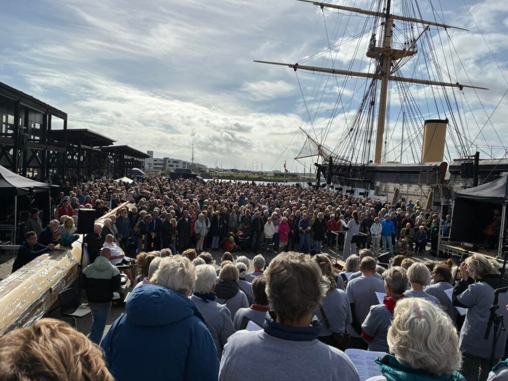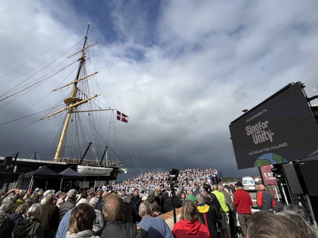 Pladsen var fyldt med syngeglade menneskerFoto taget fra tribunen hvor 300 sangere sang for. Det var kor fra Syddjurs, Norddjurs og Århus, der havde øvet på forhånd.Malthe Volfing Højager (cello), Niels Ulbrandt (klaver) og Jens Emil Jensen (trommer).Himlen var omskiftelig og til tider dramatisk, vi fik både sol, vind og regn.Tekster blev vist på storskærm, og vi var på opkald med et kor i Victoria Park i London lige op til kl 15, hvor de stod klar til at overtage lydbølgen.Vibe Ulbrandt dirigerede
